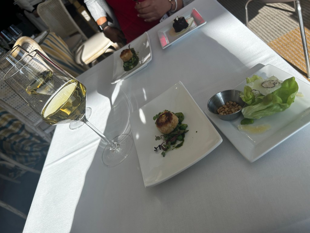 They served a Heart of Palms imitation crab cake! Oh my goodness! It was delicious! I don’t like crab cake but that right there was finger-licking good! They put, I believe it to be pea purée underneath the crab bite. (See what I did there, “purée”.)